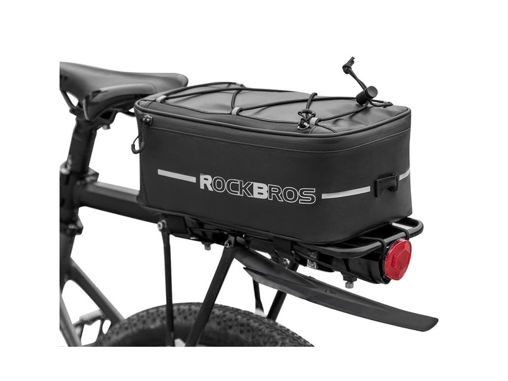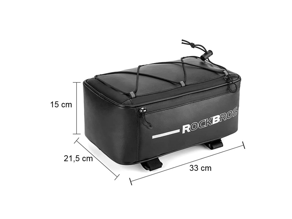 Cyklistická taška na kola, vodotěsná, reflexní 10,5L, černá s pláštěnkou. Brašna na nosič kol Rockbros je vyrobena z nepromokavého PU materiálu a vodotěsného zipu. Součástí balení je i pláštěnka. Dokonale chraňte své věci. Tato taška má reflexní design na horní a 2 stranách, aby se zlepšila viditelnost v noci. Vzadu je držák zadního světla. Velká kapacita 8,5L s více přihrádkami a elastickou šňůrou na vrchu. Taška na kolo pojme fotoaparát, oblečení a sluneční brýle. Horní kapsa na zip na peněženku, klíče, mobil apod. Tašku připevníte jednoduše, 4 suchými zipy, je velmi stabilní. Můžete snadno a rychle nasadit nebo demontovat. Hodí se na většinu nosičů kol.