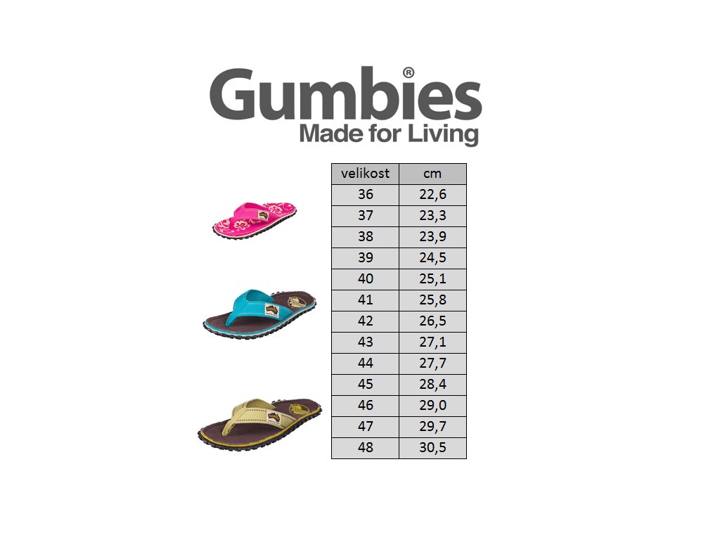 Žabky Gumbies byly navrženy s velkým etickým důrazem na použití přírodních materiálů. Podrážku tvoří recyklovaná guma spojená s jutovou sítí a stélka podrážky je potažená přírodním plátnem pro ještě lepší pohodlí. V současnosti existuje nepřeberné množství barevných kombinací, mezi kterými si každý vybere podle svého vkusu.