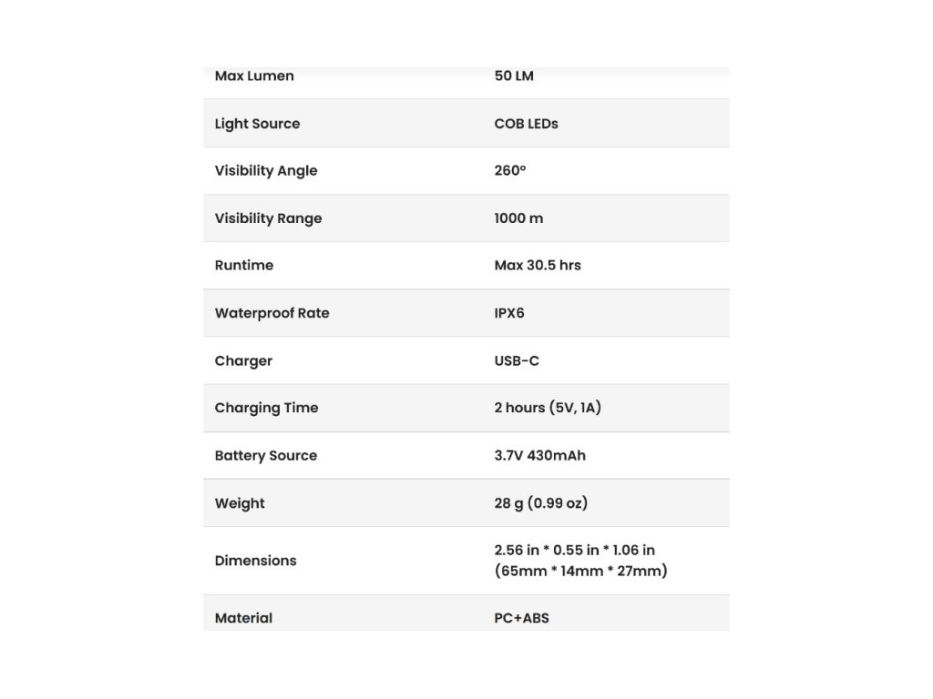 - Výkon 50 lm – jasné červené světlo viditelné až na vzdálenost 1 km.